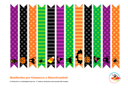 Ecco delle mini bandierine per Halloween! Ritaglia le bandierine e attaccale sulle cannucce o sugli stuzzicadenti: vedrai che bell’effetto sulla tua tavola preparata per la Festa di Halloween!