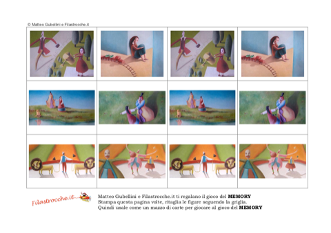 Da Filastrocche.it ecco un divertente Memory con le bellissime illustrazioni di Matteo Gubellini. Realizzatelo insieme ai vostri amici: stampate due volte le immagini su un cartoncino, ritagliate le tesserine e disponetele su una tavolo con l’immagine rivolta verso il basso. A turno ogni giocatore girerà due tessere per volta, che tutti vedranno, cercando di trovare due figure uguali fra loro. Chi trova le coppie, prende le carte e gioca di nuovo; chi sbaglia, rigira le carte scoperte e passa il turno al giocatore successivo. Vince chi ha totalizzato il maggior numero di coppie