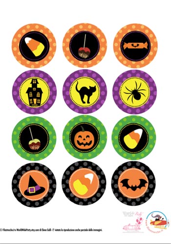 Decorazioni per Halloween fai da te: cerchietti terrificanti! Queste paurose decorazioni possono essere usate in tanti modi diversi. Se le stampate su carta adesiva, per esempio, potete usare i cerchietti per decorare piatti e bicchieri… Oppure potete stamparli su cartoncino e usarli come decorazioni su panini e pizzette (incollandoli sugli stecchini). A due a due pinzati intorno ad una cannuccia saranno delle decorazioni per la vostra tavola di Halloween!