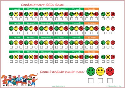 Problemi di capricci a scuola? Prova a risolverli con il Condottametro! Stampalo, compilalo e appendilo in classe; ogni giorno, segna com’è andata e a fine settimana dai il tuo giudizio complessivo. Alla fine del mese se il giudizio è positivo: la classe merita di sicuro un premio!; se è così così: la classe si deve impegnare a migliorare; se è negativo: la classe deve mettercela tutta: migliorare non è poi così difficile!!