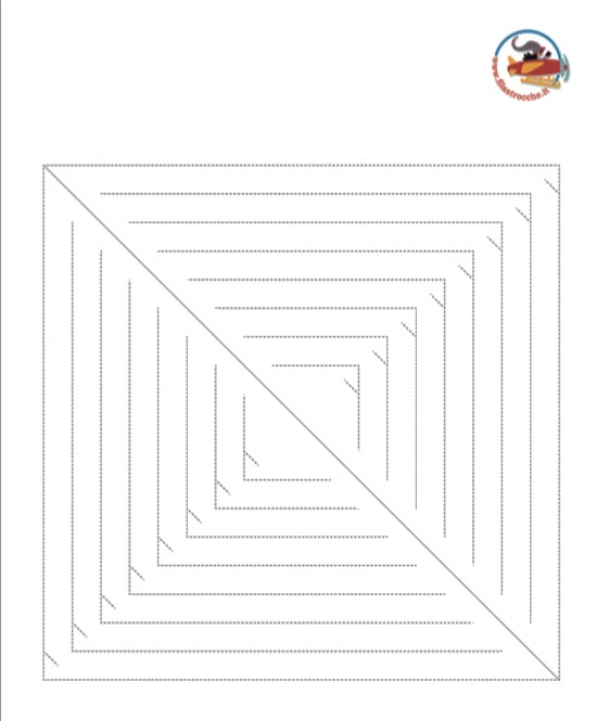 Quindi ritagliate lungo tutte le linee tratteggiate (ma non lungo la diagonale del quadrato!) e realizzate la decorazione come vedete nella foto qui sotto, piegando alternativamente prima da un lato a poi dall’altro le varie strisce, fissandole con un punto metallico oppure incastrandole nei piccoli taglietti che avrete praticato con la forbice.