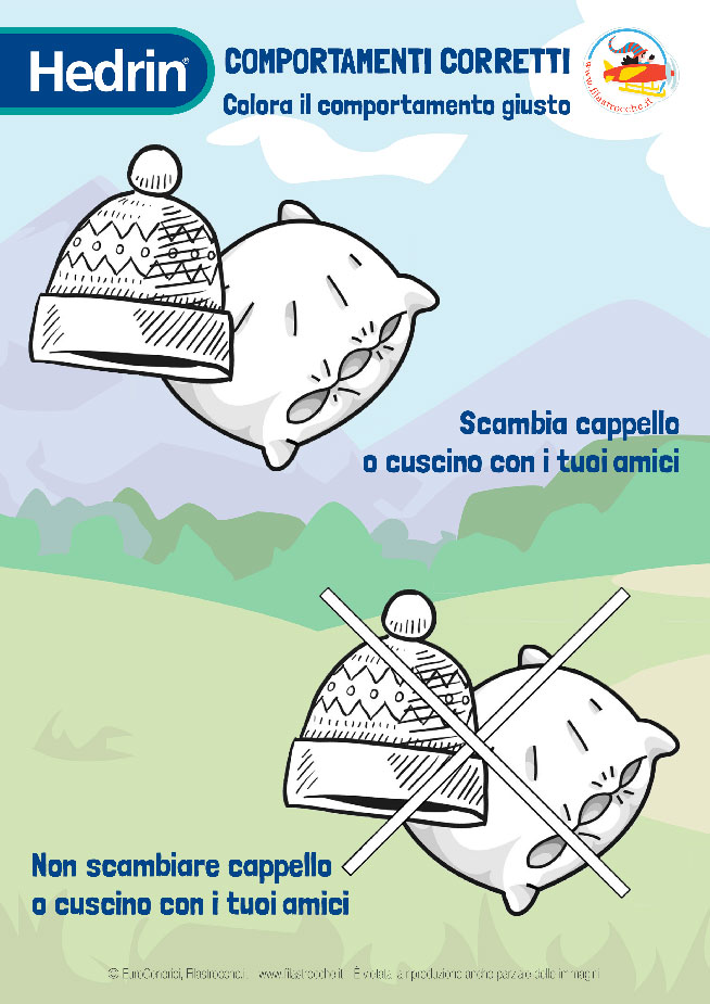 Impara a tenere lontani i pidocchi! Ci sono cose da fare e cose da non fare se vuoi ridurre le probabilità di averli sulla testa…. Scarica i simpatici disegni che abbiamo preparato per te e colora i comportamenti corretti. Scambiare cappello e cuscino sarà tra le cose da fare o da non fare?