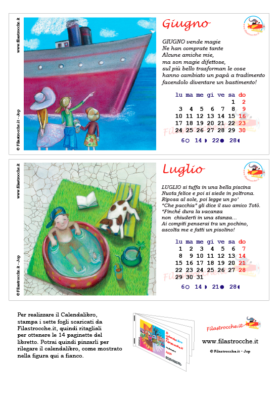 Una volta visualizzato il Calendalibro in pdf, non dovrete far altro che stamparlo e ritagliare le paginette del libretto. Le pagine del calendario sono in tutto 14: 12 per i dodici mesi dell’anno e poi una copertina iniziale e una finale con l’augurio di un Buon 2023! 🙂