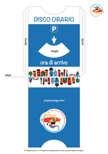 Quindi ritagliate lungo il contorno sia la “busta” che il disco da inserirvi dentro. Piegate la busta come indicato nelle istruzioni e costruite il disco orario, fissando il tutto con un fermacampione (graffetta fermacampione).
