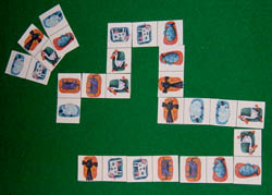 Quindi il giocatore che ha in mano la tessera doppia di valore più alto, la pone in mezzo al tavolo. Seguendo il senso orario, a turno, gli altri giocatori disporranno le proprie tesserine vicino ad una delle due estremità della fila già presente sul tavolo, a patto di possedere una tessera con il numero o la figura uguale ad una delle due estremità della coda.