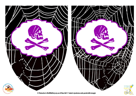 Realizzare il festone è molto semplice: vi basterà stampare il file pdf che trovate linkato qui sotto e poi ritagliare le bandierine con i teschi e le ragnatele. Quindi attaccate le bandierine lungo un filo o un cordoncino nero. Potete farlo con l’aiuto di una pinzatrice a punti metallici o facendo dei piccoli fori lateralmente sulle bandierine e poi infilandoci dentro il filo.