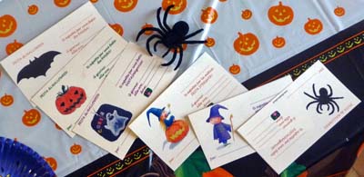 Che ne dite di un bell’invito a forma di zucca? Oppure un bel pipistrello! Come?!? Fantasma? Certo abbiamo anche quello! E perchè no, abbiamo anche uno spaventosissimo invito con un ragno tutto nero!