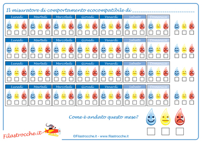 Quindi ogni sera dovrete indicare come vi siete comportati verso l’ambiente durante la giornata, segnando una crocetta sulla goccia azzurra se vi siete comportati in modo corretto, una crocetta sulla goccia gialla se vi siete comportati in modo quasi sempre corretto e una crocetta sulla goccia rossa se vi siete comportati in modo scorretto!