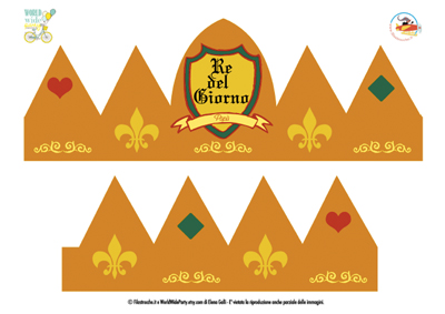 Realizzare la nostra Corona da Re del Giorno è facilissimo: vi basterà stampare il file con la corona, ritagliare lungo il controno e poi costruire il diadema con l’aiuto di nastro adesivo o punti metallici.