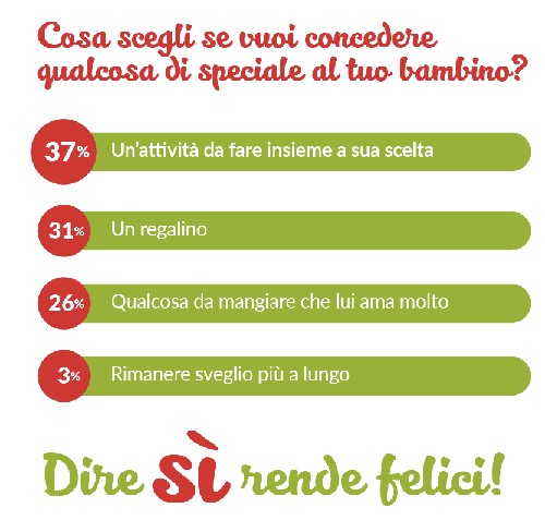 A volte è solo questione di cambiare prospettiva e rigirare il divieto in positivo. Ad esempio, quando tuo figlio ti chiede di mangiare mezz’ora prima di cena, anziché un NO secco perché non si mangia prima di andare a tavola, si può rispondere che può mangiare un bastoncino di carote o uno spicchio di mela. Il risultato è lo stesso (perché l’appetito non si guasterà) e noi non ci saremo giocati il NO, che possiamo tenere in canna per la prossima più importante occasione.
