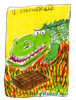 Imbonitore: – Venghino siore e siori ad ammirare il superbolante e miraboglioso Cioccodrillo, più che una bestia, un animale! Il farantastico Cioccodrillo non mangia carne, nonnonnò! Non mangia insalata, nonnonnò! Non mangia pesce, nonnonnò! Il supramigliosso Cioccodrillo mangia solo cioccolato!