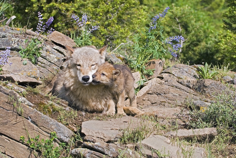 Nelle prime settimane di vita i lupetti dipendono totalmente dalla madre, che con le sue attenzioni li protegge e li nutre.