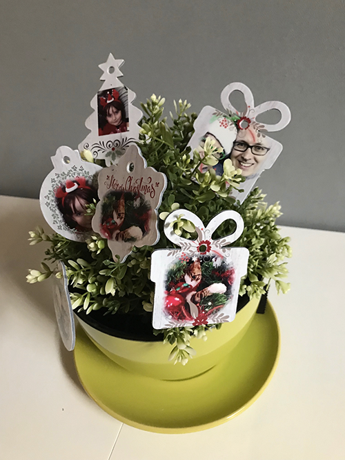 Io ho deciso di fare una specie di albero genealogico di Natale, appendendo al posto delle solite palline, tante decorazioni natalizie personalizzate con la faccia di tutti i componenti della famiglia, gatto compreso.