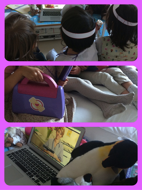 Le bimbe invitate, in compagnia del loro peluche preferito sono arrivate tutte insieme dopo la scuola e grande è stato l’effetto sorpresa: non capita tutti i giorni di trovare la sala trasformata in una specie di infermieria sui toni del violetto.