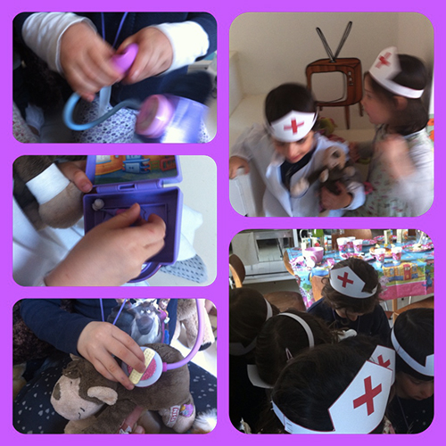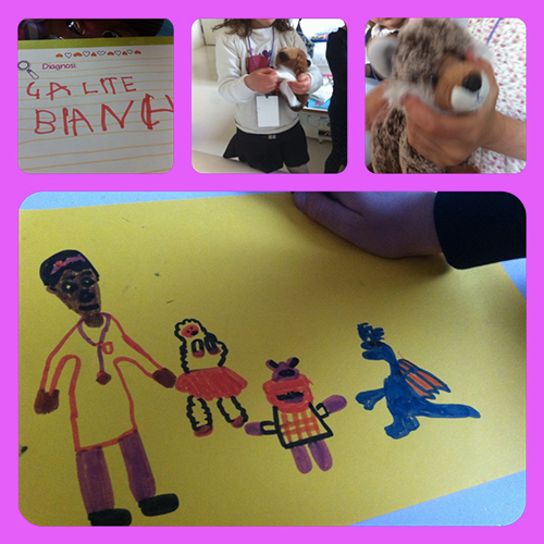 Scimmie, pinguini, cani e orsacchiotti sono stati visitati da un equipe di professioniste: la pressione, il termometro nelle orecchie, il cuoricino e poi garze, bende e cerotti per tutti!