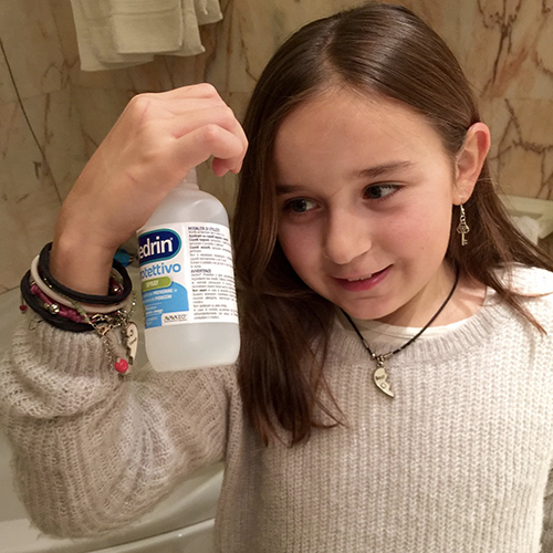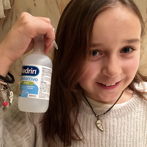• Prevenire è meglio che curare. Ci martellano con il mantra della prevenzione in tutti i campi, perché dunque non metterla in pratica anche per proteggerci dai pidocchi? Io ho cominciato con Aurora, dopo che con i miei figli più grandi avevo provato di tutto. Non vi parlerò di oli essenziali pestilenziali che nella mia esperienza più che le odiose bestiole tengono lontano gli altri esseri umani, ma di un prodotto spray Hedrin senza additivi chimici, che va spruzzato sulla chioma pulita un paio di volte alla settimana e protegge i capelli formando una sorta di barriera di silicone inespugnabile al pidocchio. Mia figlia è ormai grandicella e, dopo le prime volte, ha cominciato a utilizzare il suo spruzzino magico da sola, dopo shampoo e balsamo, nel suo lungo rituale di bellezza serale. E ci sta prendendo gusto, anche perché il profumo di questa lozione è davvero invitante (: (ma questo è il prossimo capitolo ).