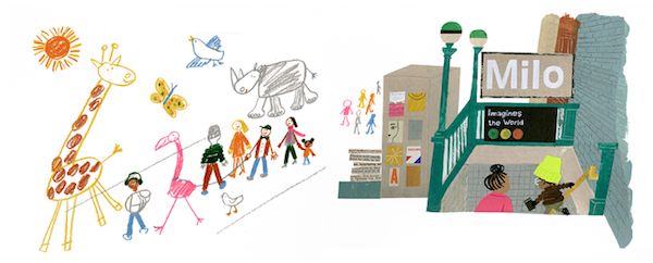 Nasce così un mondo diviso in due, o meglio prendono vita due mondi paralleli: la realtà e l’immaginazione, il mondo in cui Milo esiste e il mondo reinventato che è nella sua testa. Le parole prendono forma, espresse visivamente dai due stili grafici delle illustrazioni: da una parte le tavole a colori pieni che mixano dipinti e collage con forme robuste e geometriche, dall’altra parte i disegni infantili a pastello con le linee spesse e le forme arrotondate del mondo n. 2: l’immaginazione.