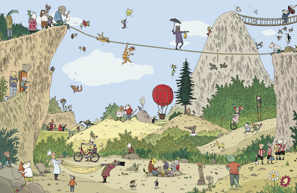 Un libro “brulicante”, che senza parole, ma solo attraverso le illustrazioni, racconta una giornata piena di emozioni. I bambini, tavola dopo tavola, seguiranno le vicende dei vari personaggi: il calciatore troverà abbastanza amici con cui giocare? Chi sta inseguendo la gallina, e perché? Quale tesoro stanno cercando l’orso e il bue? E il maialino dove sta portando il suo pesce rosso?