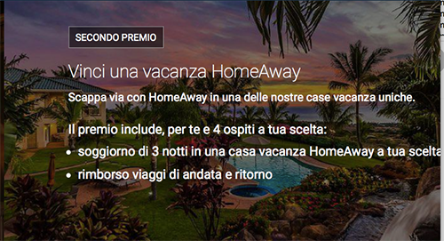 Tre notti da principi e principesse da trascorrere in un suggestivo castello HomeAway con più di 12 stanze insieme a 20 amici: questo è il primo premio per il fortunato che verrà estratto. Mentre al secondo spetta una vacanza per 5 persone in una delle tantissime case vacanza HomeAway.